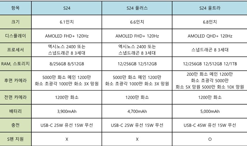 | 갤럭시 S24 울트라 | 12/512GB | 1,599,000원 |